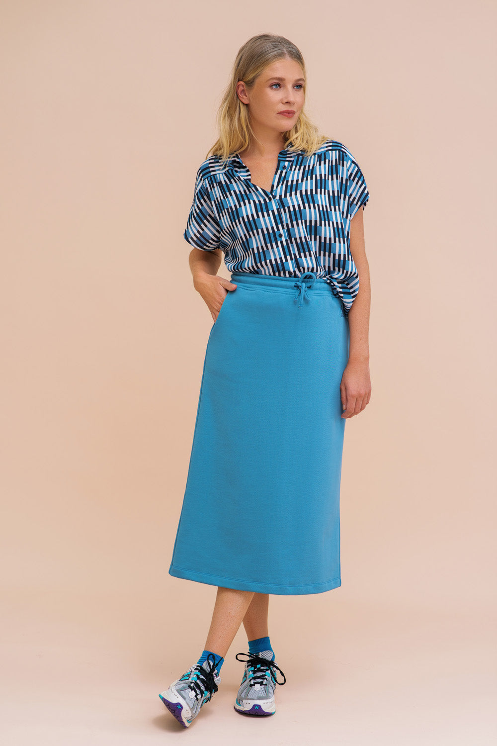 Sportieve, iets uitlopende lange rok van katoenen joggingstof met een charmant borduursel van Amsterdamse huisjes. De rok heeft handige steekzakken, een elastische taille met koordje, een split aan de achterzijde en valt tot op de kuit. Combineer ‘m met de bijpassende tops of met een van onze zomerse prints voor een frisse, sportieve look.</p>