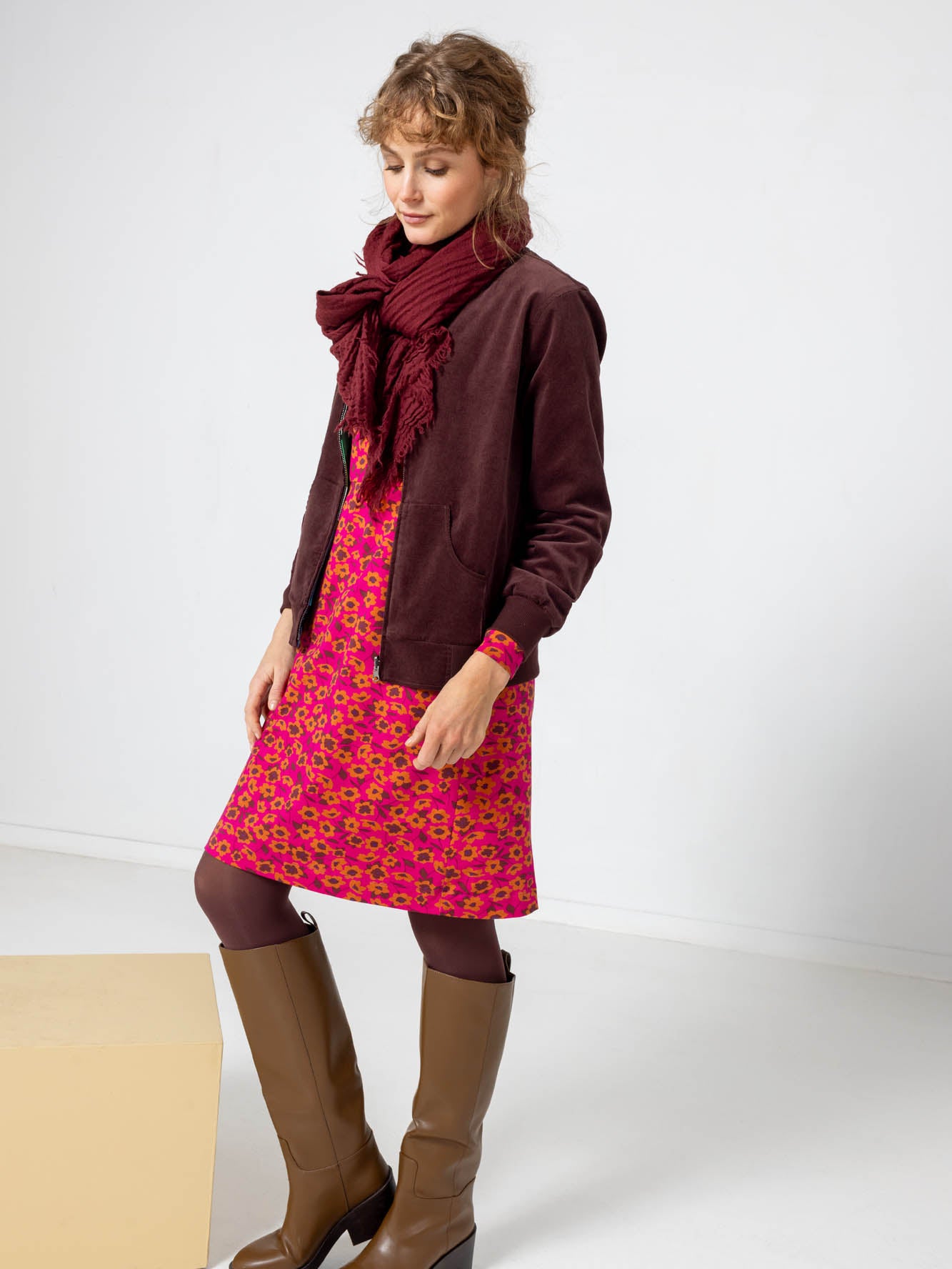 L'une de nos robes préférées. Cette robe présente une encolure ronde large, une coupe droite, des manches longues et des poches. Elle arrive au genou pour une personne mesurant 1,69 mètre.