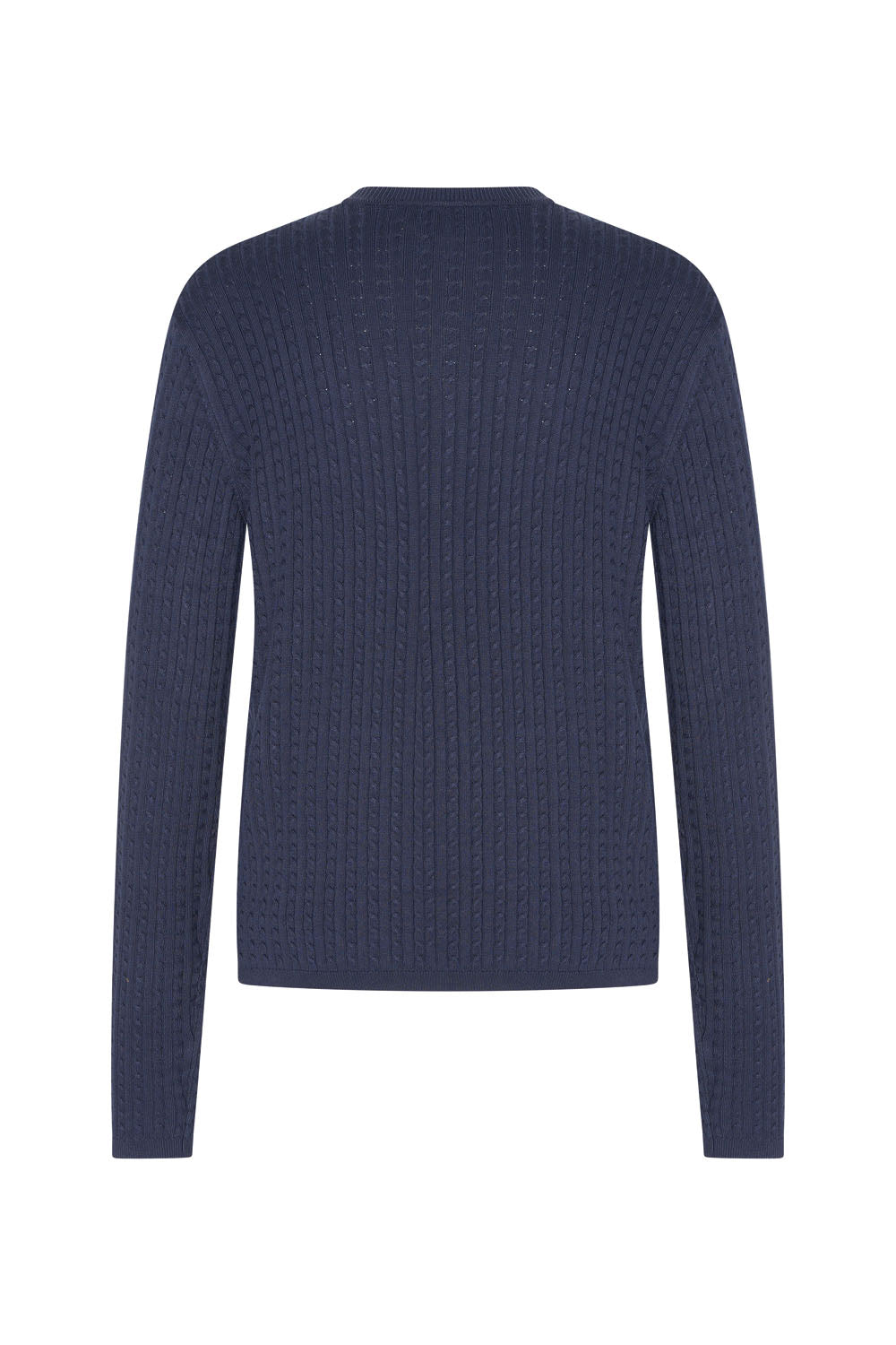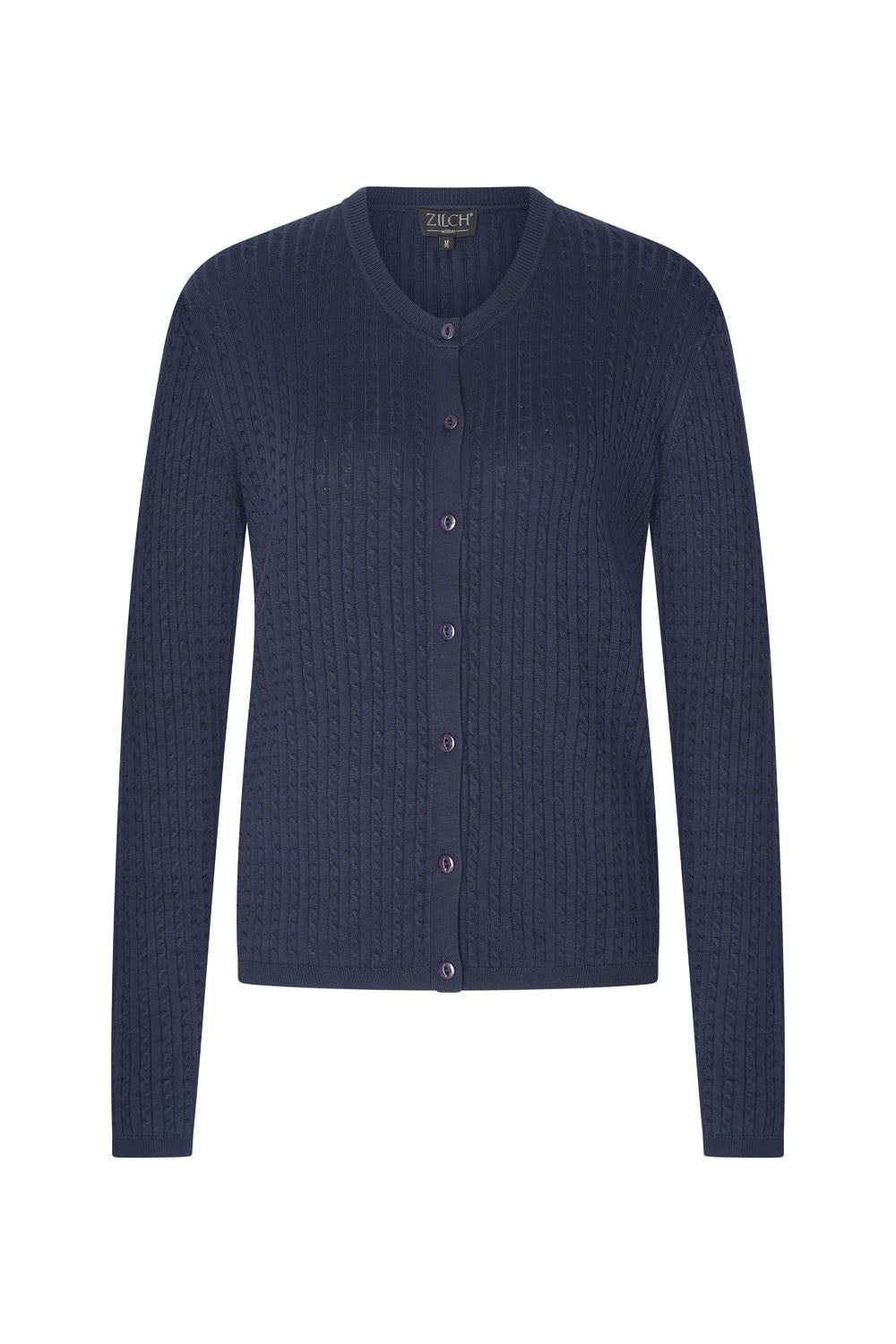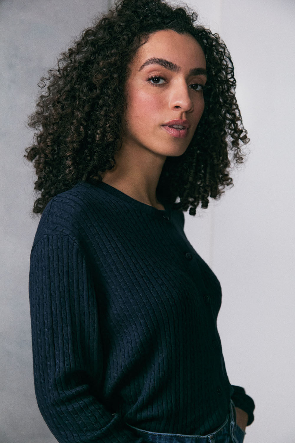 Notre cardigan basique à col rond et manches longues présente une maille raffinée à torsades horizontales. Confectionné en viscose douce à base de bambou, il est doté d'une fermeture boutonnée et de finitions côtelées étroites aux poignets, à l'encolure et aux manches.