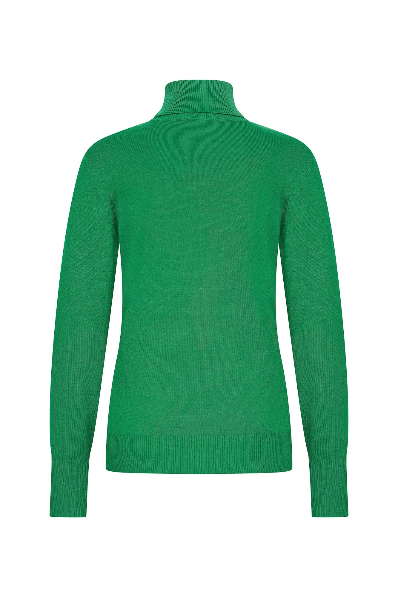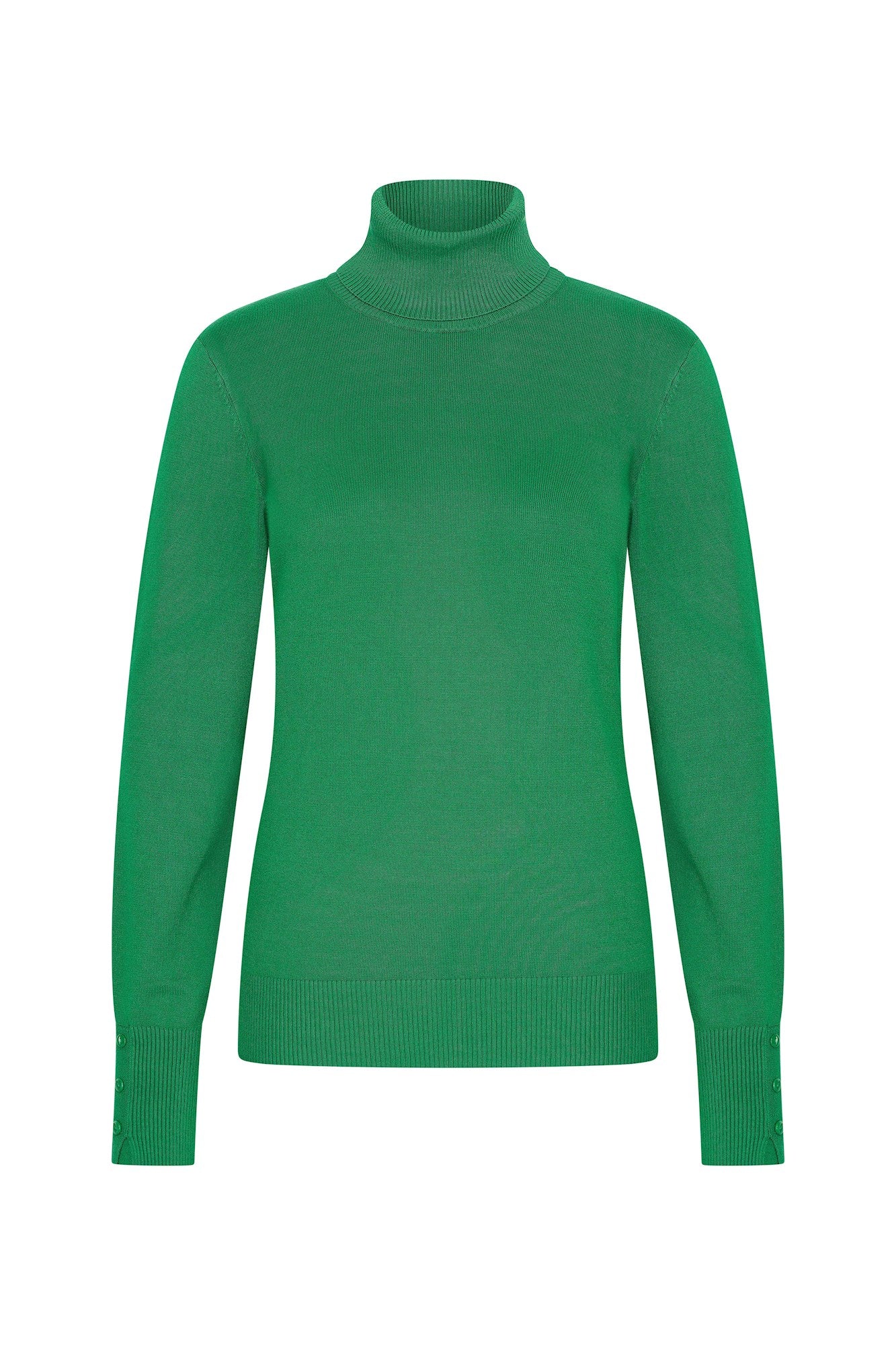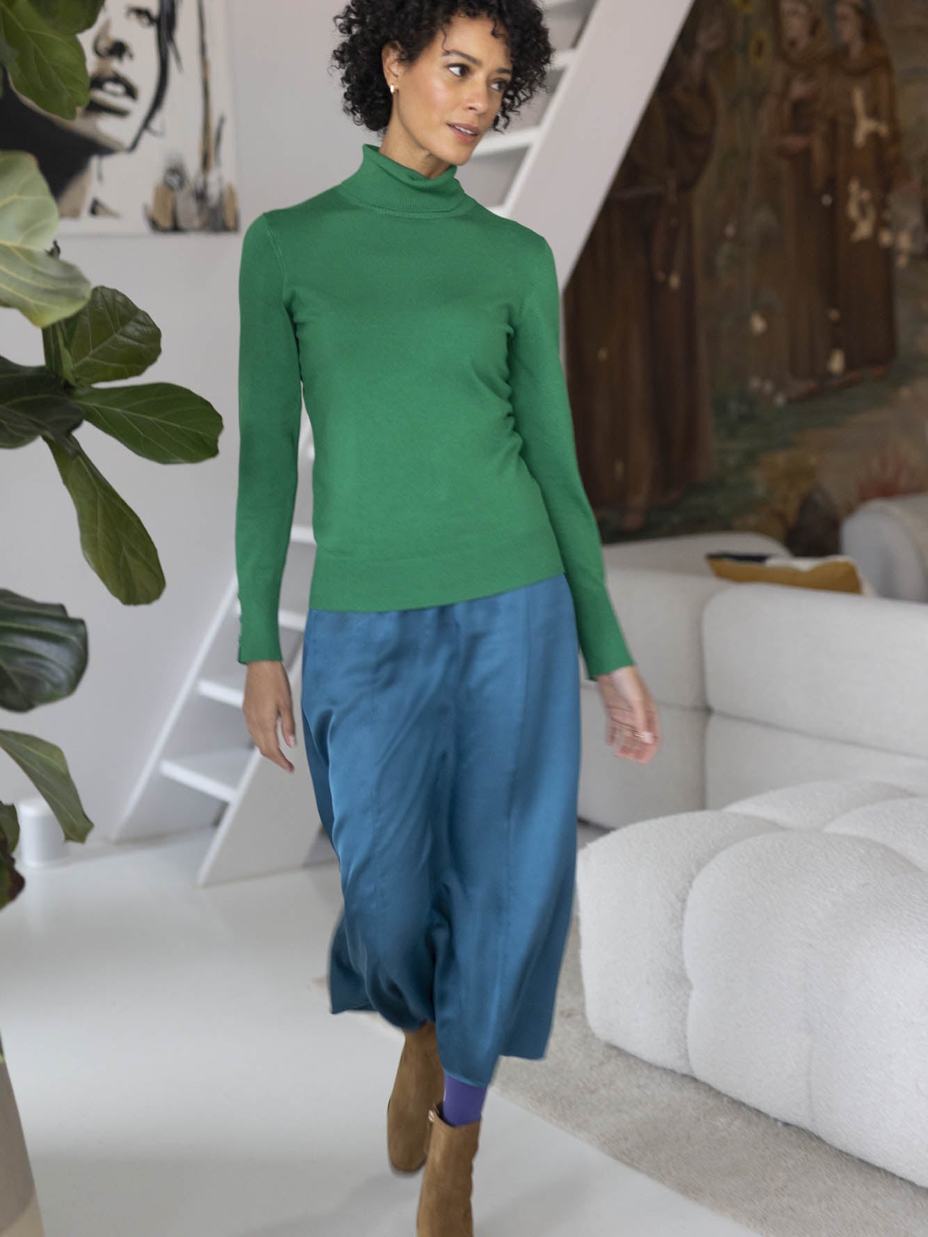 Un pull à col roulé côtelé à manches longues, confectionné dans une viscose de bambou d'une douceur incomparable. Les poignets légèrement plus longs sont ornés de trois boutons décoratifs. À porter avec une jupe tulipe pour une allure élégante.