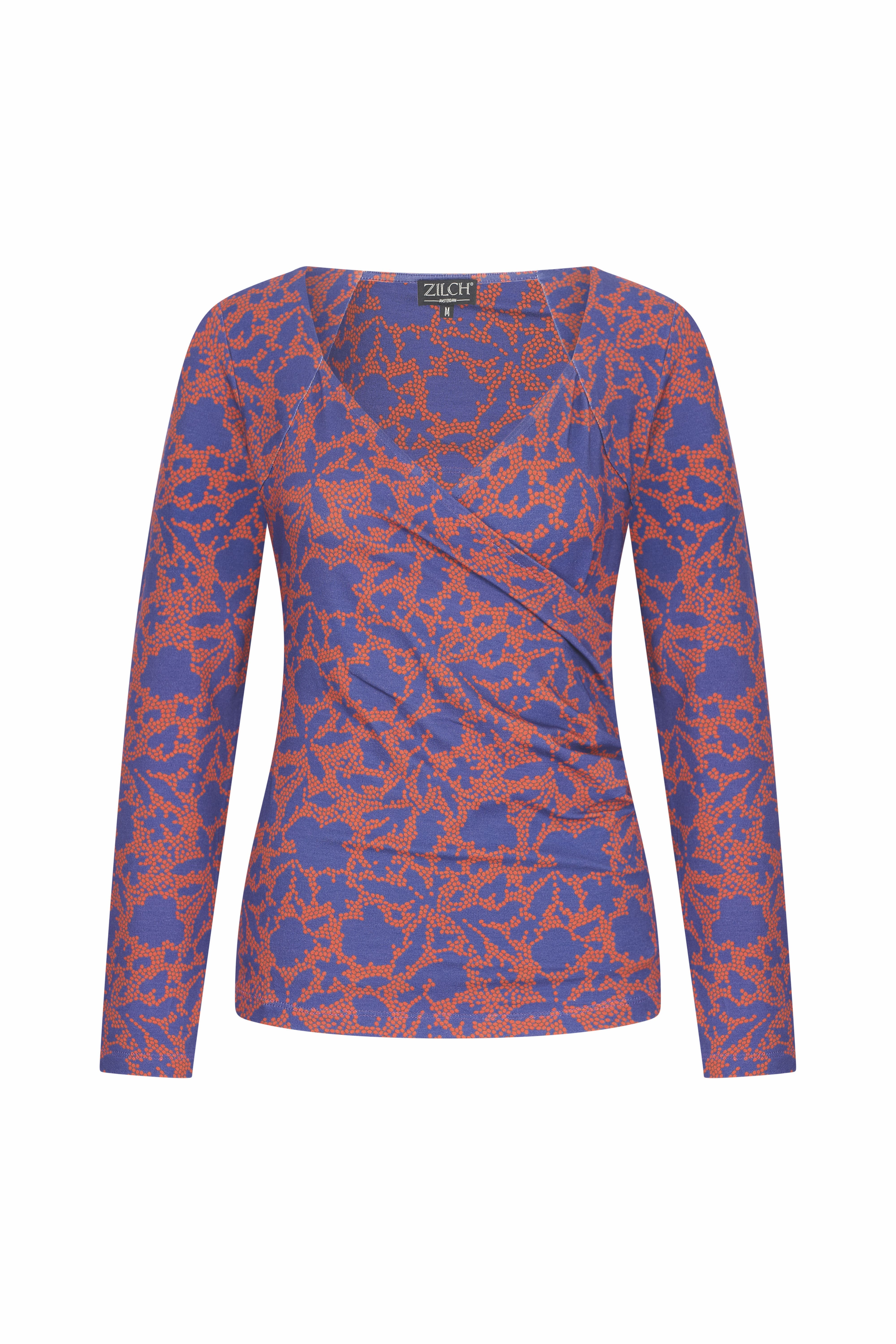 Un top fluide et ajusté en jersey, à col V et devant cache-cœur, confectionné en viscose Lenzing EcoVero à imprimé coloré. Le devant cache-cœur est maintenu par un pli discret pour un effet froncé subtil et une silhouette flatteuse. Un top idéal à porter sous un cardigan chaud lors des froides journées d'hiver.