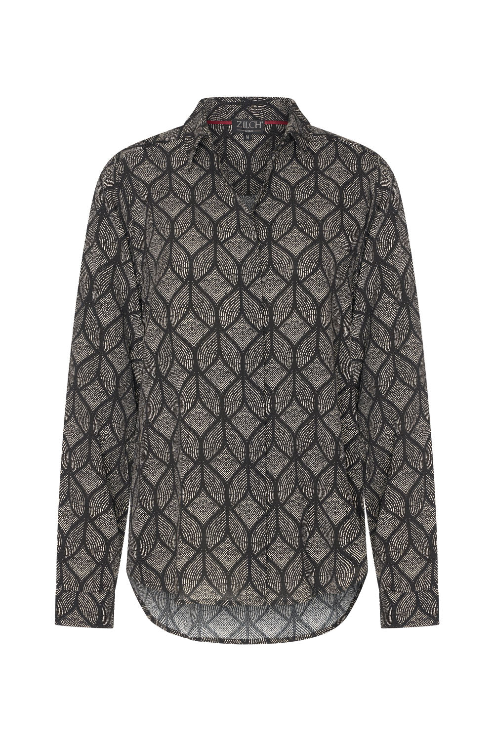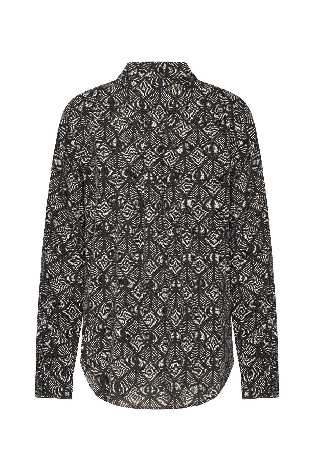 Blouse à imprimé hivernal élégant, fermeture boutonnée dissimulée et col pointu, en crêpe de viscose souple et fluide. Les manches sont terminées par des poignets boutonnés.