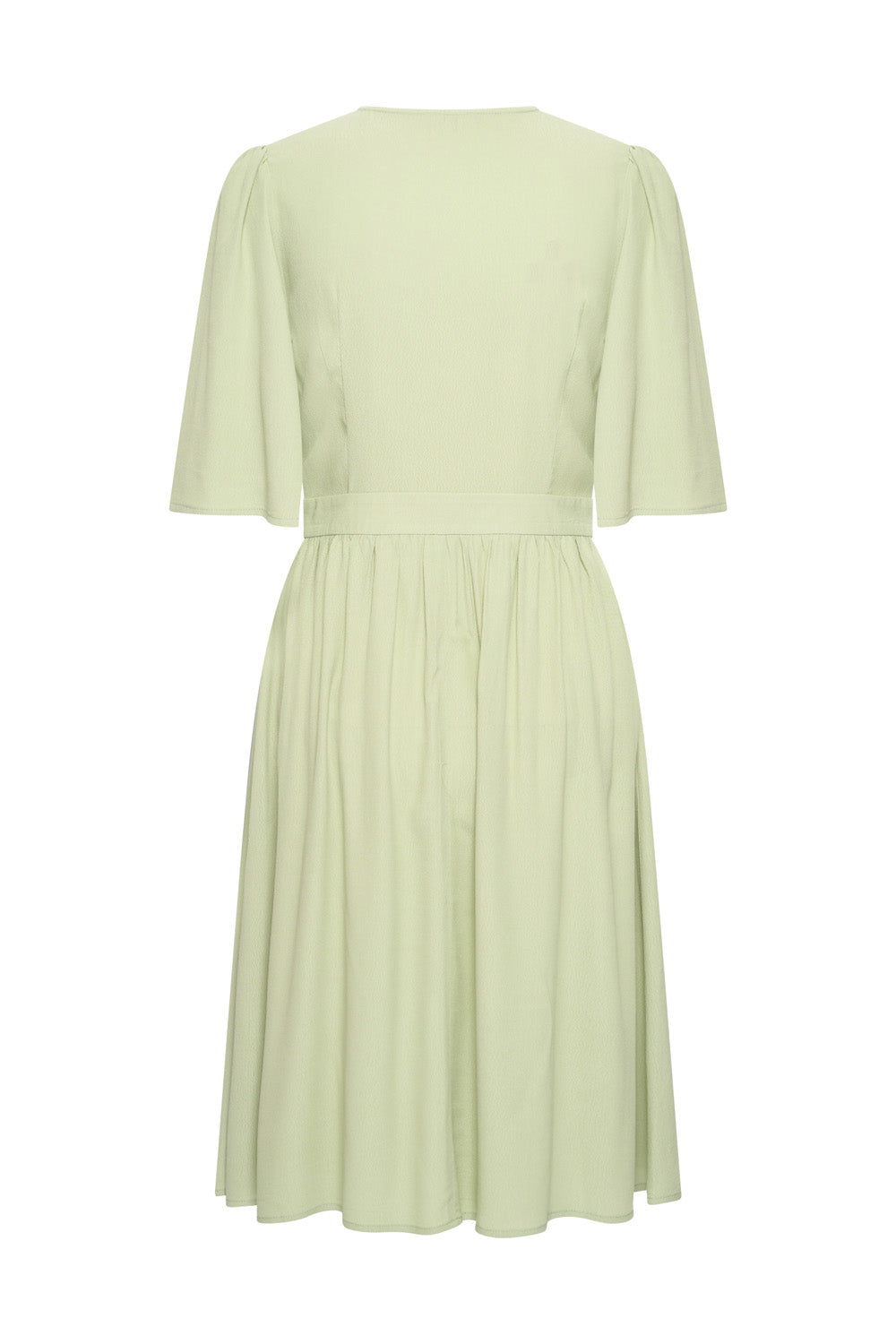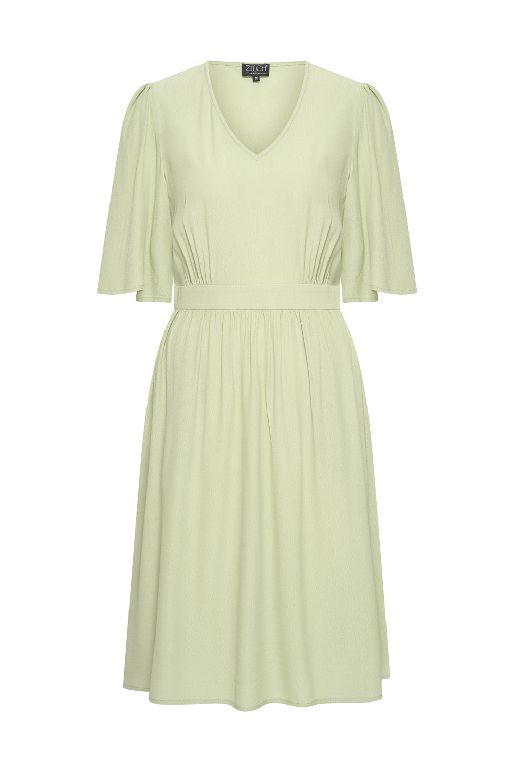 Robe d'été légère en crêpe de viscose, coloris estival et élégant, avec un décolleté en V, des manches amples arrivant aux coudes et des poches. Sa coupe ample, rehaussée d'une taille cintrée, souligne la silhouette féminine.