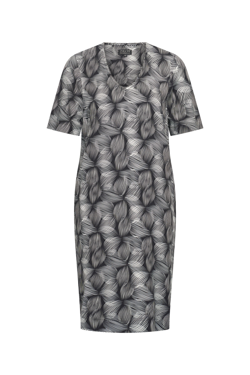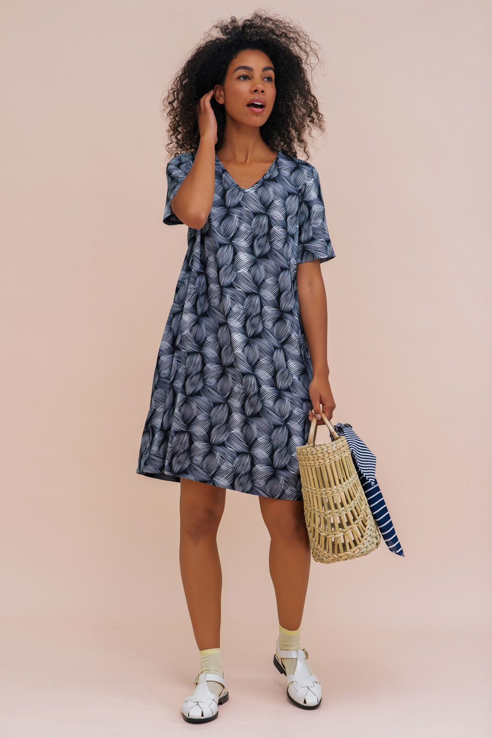 Robe d'été ample à manches courtes, col en V et poches. Confectionnée en viscose tissée légèrement extensible, elle se décline dans une variété de jolis imprimés graphiques.